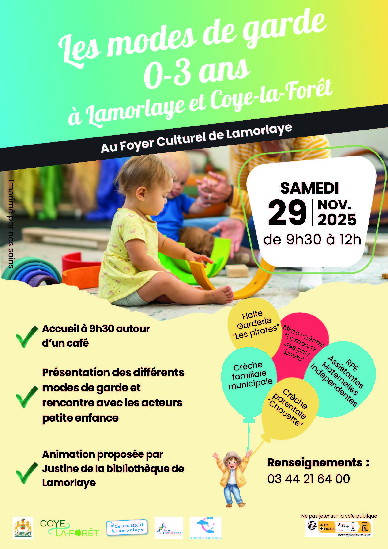 Le Centre Social de Lamorlaye organise une matinée d’information dédiée aux modes de garde des enfants de 0 à 3 ans, en présence des différents acteurs petite enfance du territoire.